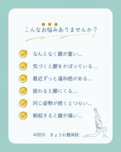 腰痛は、日常生活の姿勢や体の使い方のクセなどが原因で起こることが多く、